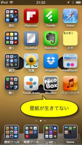 パソコンのデスクトップには何も置かない派。 ましてiPhone/iPod touchの画面は狭い。アイコンを置いてしまうと壁紙が見えません。これじゃあ、個性の出しようがない。実用的なだけでは飽きてしまう。 それでアイコンを長押しし、ぷるぷる震え始めたら、フォ…