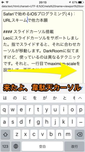 Safariで始めるiOSプログラミング(3):ブログでシェアする方法 スライドカーソル搭載Leoにスライドカーソルを追加しました。指でスライドすると、それに合わせカーソルが移動します。二本指だと範囲選択。DarkRoomに似てますけど、使っているのは異なるテク…