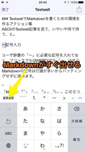ASCIIのTextwell記事を見て、いやいや待て待て、と。 記号入力アクションは使いません。ユーザ辞書を使う。「ー」に必要な記号を登録しておきます。フリックでもQWERTYでも「ー」はすぐ呼び出せるし、行頭には来ない。Markdownは行頭が多いので、バッティン…
