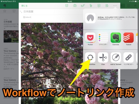 Evernoteで「共有」から「Run Workflow」を起動します。そして「LinkFlowy」を選んで「非公開リンク」を作る。するとHandyFlowyが立ち上がるので貼り付けるだけ。