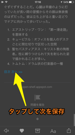 ページの最後に至ると、わくわくの第二章へ。「次へ >>」をタップし「保存」を選択。これで第二章がInstapaperにダウンロードされ始めます。