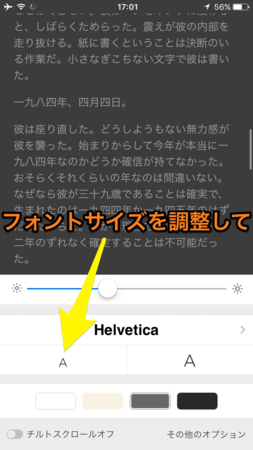 Instapaperアプリを開くと『一九八四年』がリストに入っています。ダウンロードされるのを待ってから中に入ると、そこは灰色の世界。下段の「Aa」ボタンでフォントサイズや明度、行間の調整をします。ビッグブラザーに見つからないよう暗めの設定で。