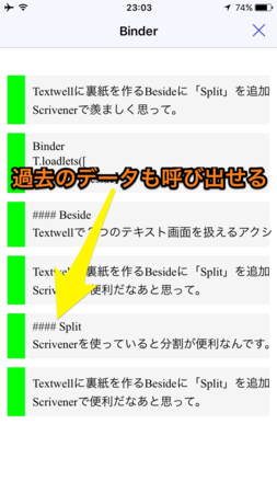 Binder経由でテキストを切り替えると、元のテキストはBinderに蓄積されます。一行目をタイトルとし、同一であれば上書き保存になります。左端の緑帯をタップするとシートを削除。二本指でスワイプすると Clear All。全部のシートを一括削除できます。