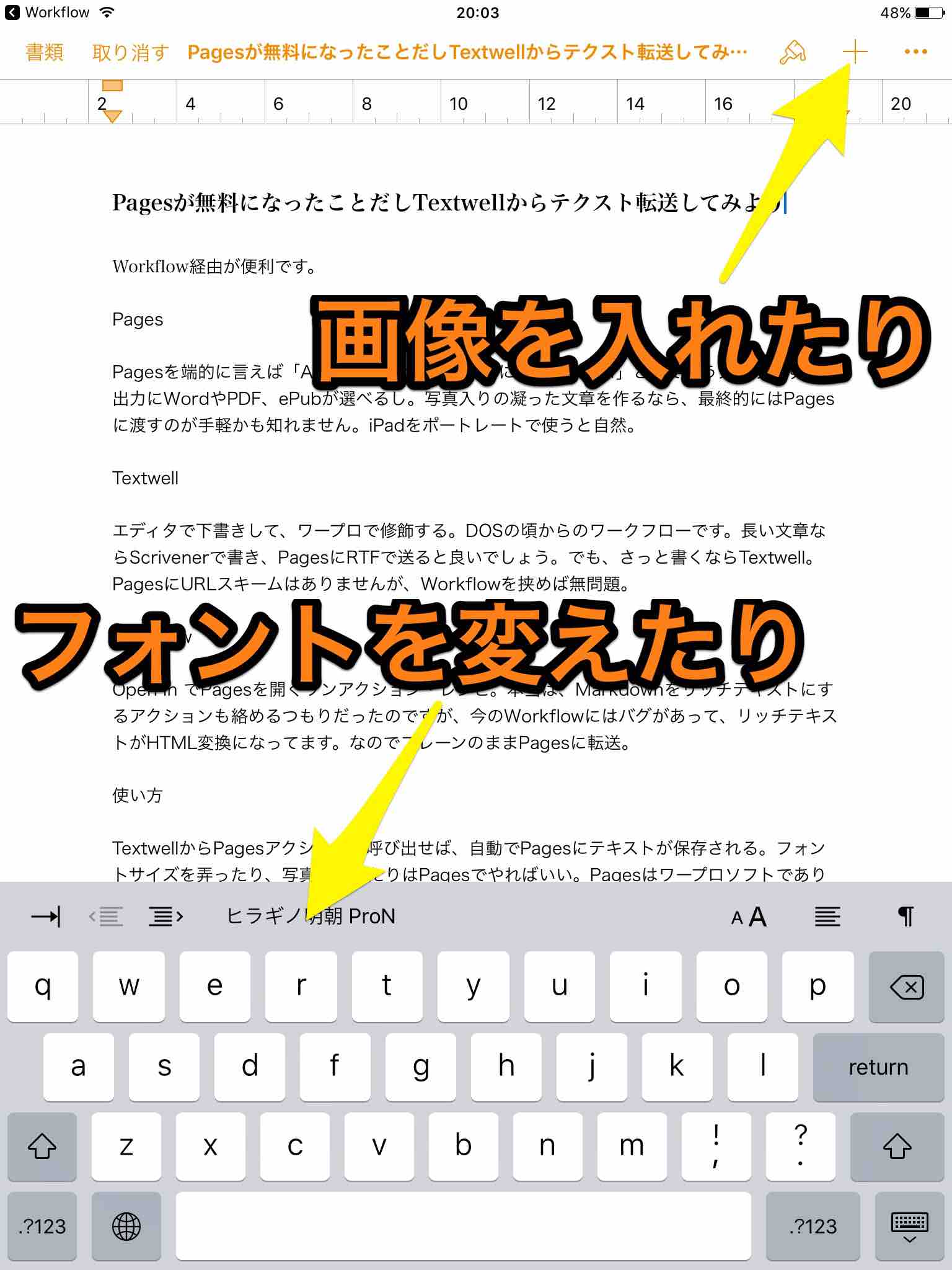 TextwellからPagesアクションを呼び出せば、自動でPagesにテキストが保存される。フォントサイズを弄ったり、写真を入れたりはPagesでやればいい。Pagesはワープロソフトでありながら、iOSとの親和性が高いので、操作にストレスを感じることがありません。