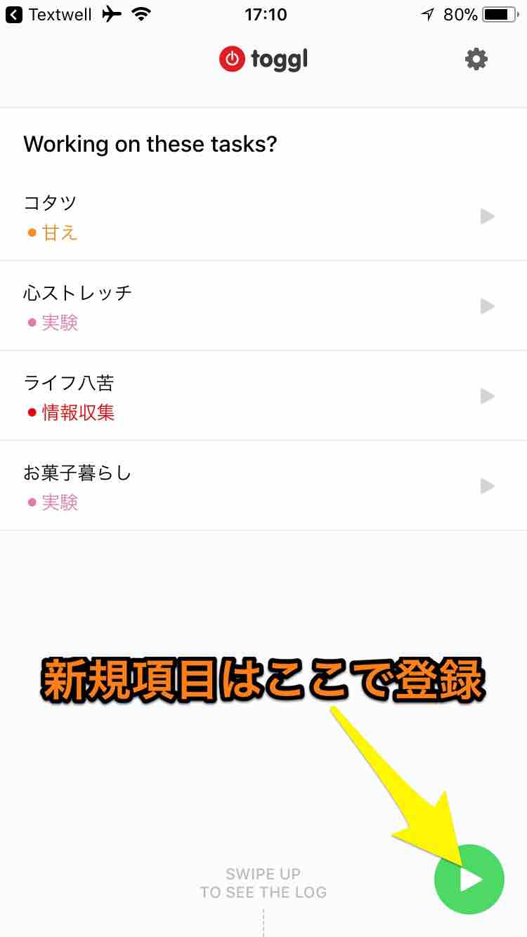 スタートボタンを押すと新規作成になるので「What are you working on?」にPaste。Textwellで書いたエントリー名が追加されます。一度タイマーを走らせたエントリーは再利用することができるので、必要な習慣名を揃えておく。野暮ったいけど、これで。
