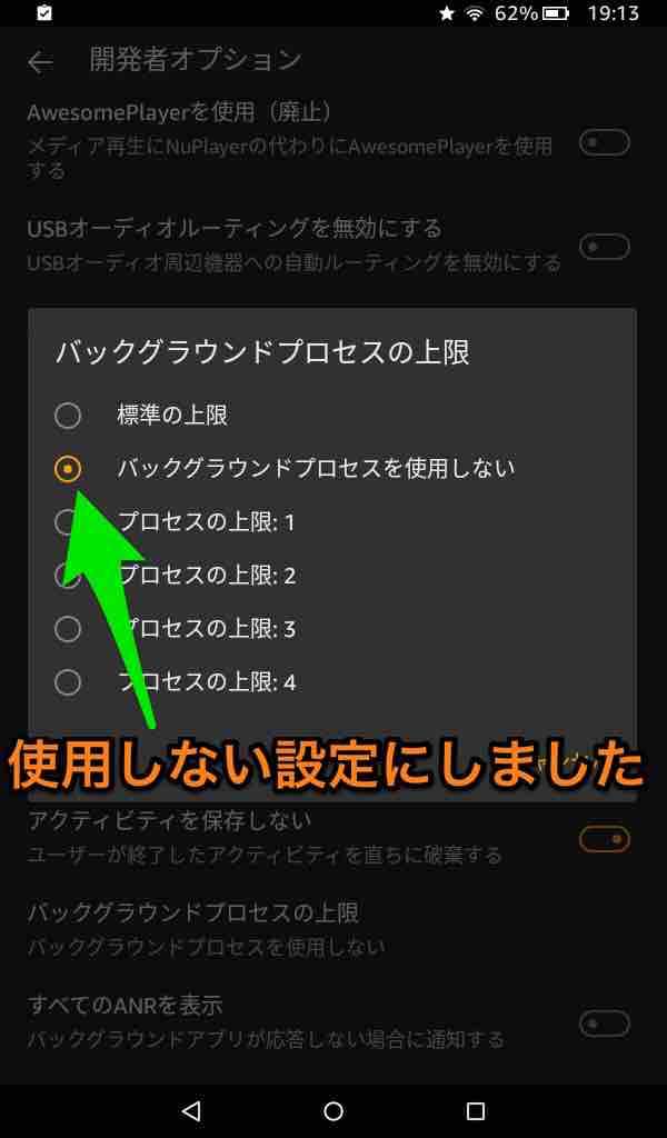 バックグラウンドプロセスを使わない設定にすると空きメモリーが増えるようで、単体のアプリの動作は軽くなりました。バックグラウンドのアプリを止めるのでしょう。でも、Spotifyで音楽を鳴らしながらSilkは起動できるし、不都合は起こらない様子です。